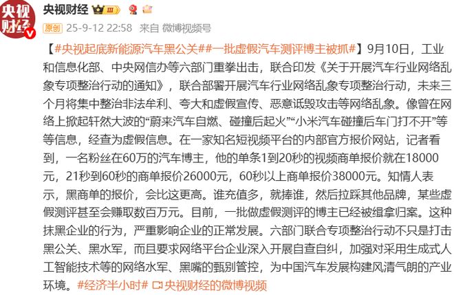 评:央视财经的曝光撕开了汽车黑公关的丑陋面具,AI造谣、虚假测评已形成完整产业链,严重扰乱市场秩序。此次专项整治与司法严惩双管齐下,既是对行业清朗的捍卫,也是对消费者知情权的保护,唯有法治利剑出鞘,方能斩断网络谣言黑手。