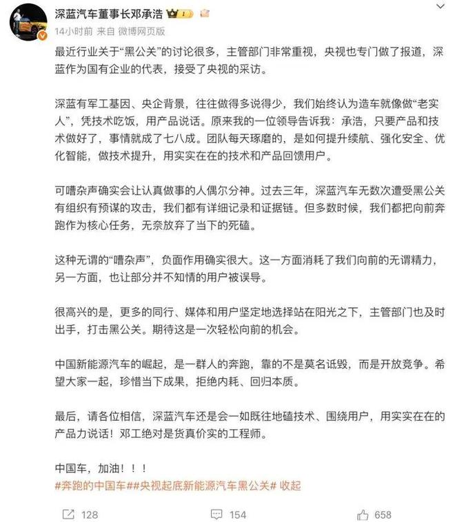 中金在线报道,日前,深蓝汽车董事长邓承浩发文谈及了黑公关,称过去三年,深蓝汽车无数次遭受黑公关有组织有预谋的攻击,都有详细记录和证据链。邓承浩表示,最近行业关于“黑公关”的讨论很多,主管部门非常重视,央视也专门做了报道,深蓝作为国有企业的代表,接受了央视的采访。很高兴的是,更多的同行、媒体和用户坚定地选择站在阳光之下,主管部门也及时出手,打击黑公关。期待这是一次轻松向前的机会。