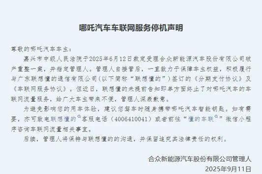 评 : 哪吒汽车深陷困境,联想懂的却“落井下石”,单方终止车联网服务,此举有失商业诚信。在合作关键期,未经告知擅自断供,损害哪吒用户权益,也破坏行业生态。哪吒管理人保留追责权利合理,期待此事能依法妥善解决。